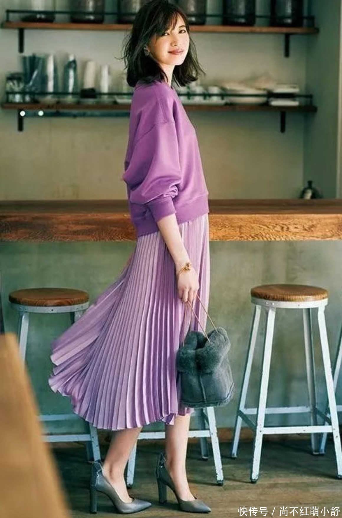 它最大的优点就是,竖向的褶裥本身就有强烈的视觉延伸感,超级显高显瘦。那么怎么搭?要诀是“化繁为简”,典范如下:
