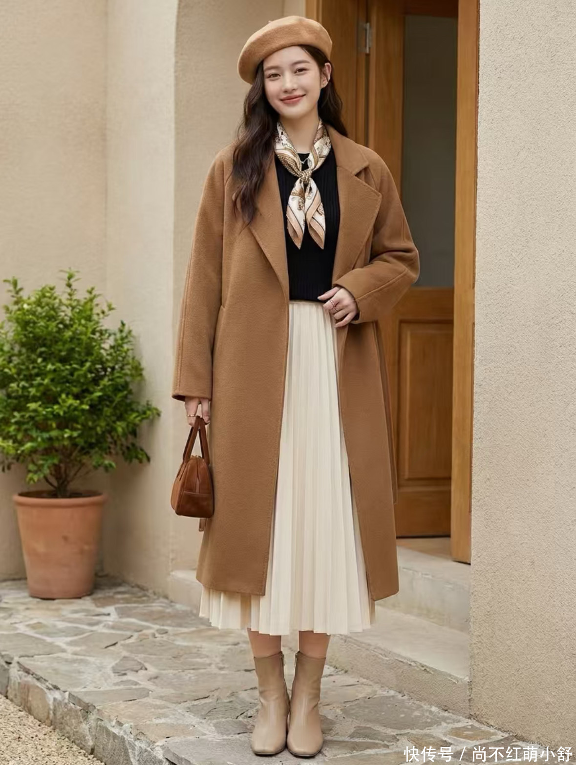 穿搭示范2:选择雪纺或轻纱材质的白色(米色)百褶裙,搭配最简单的黑色T恤和大衣,踩一双靴子。巧妙利用一条丝巾作为颈部的点缀,复杂与简单平衡得刚刚好,减龄又时髦。