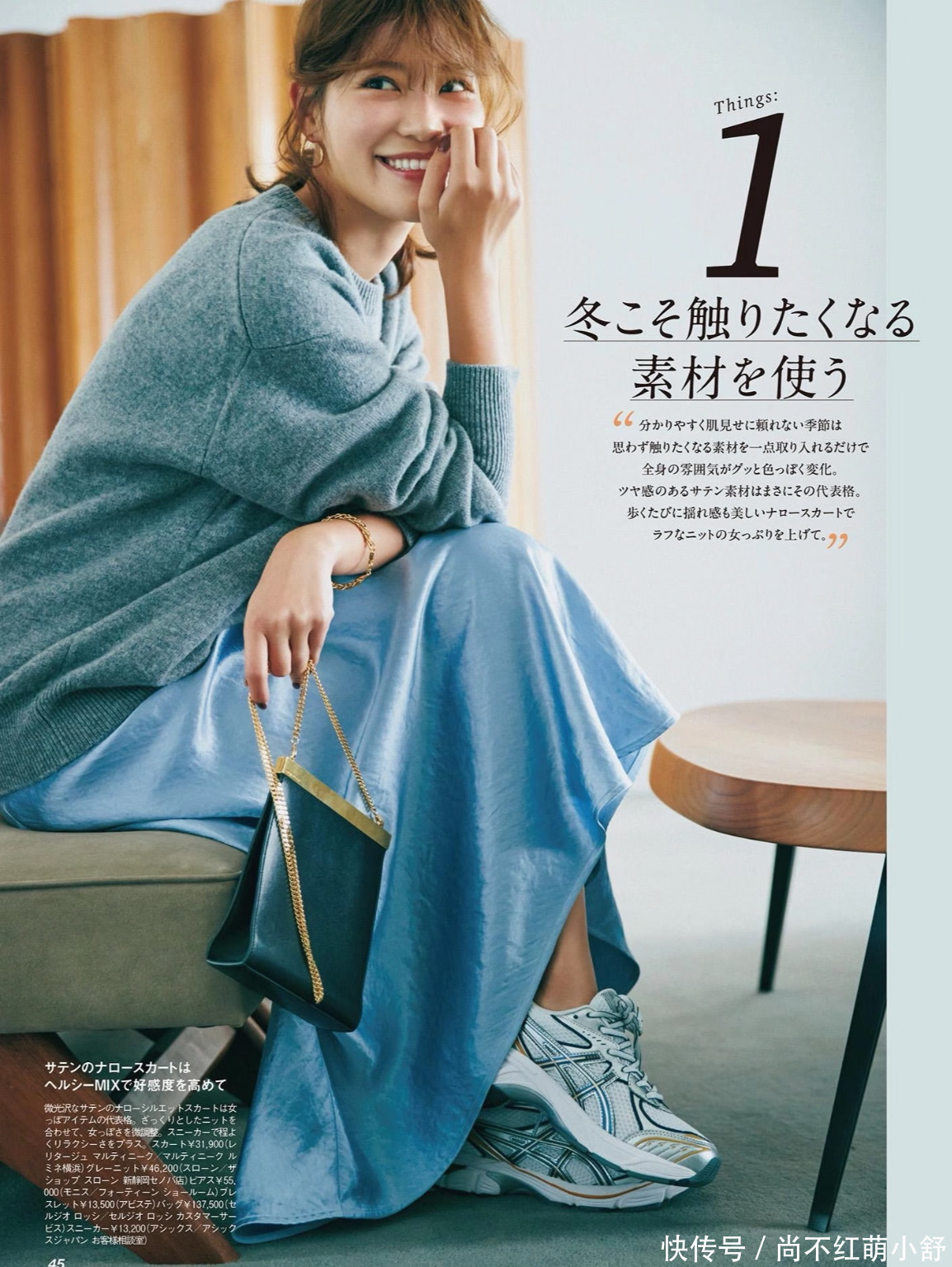 穿搭示范1:一条银灰色缎面中长裙,搭配一件宽松的灰色毛衣,脚上穿一双平底鞋。这种“上下风格反差”正是时髦精最爱的套路,毫不费力就赢了。